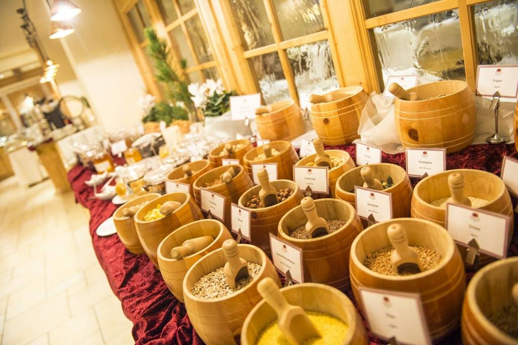 Breakfast experience with an excellent choice of options in buffet style. Lunch in buffet style including live show cooking, selection of hearty pasta, fine soups, crisp salads, other Mediterranean delicacies, fresh fruit, homemade cakes, and tartes. Dinner in gourmet style including seven-course dinner based on a range of menus or vegetarian options and Italian cuisine. Awarded with three toques by Gault Millau in 2019.